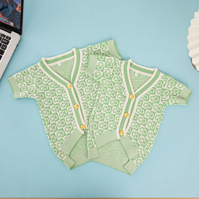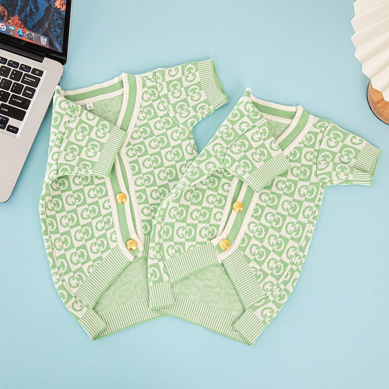 Our fashion clothes for dogs combine haute couture design with canine comfort. The signature green sweater features an iconic double-G logo, transforming your pup into a style icon from park strolls to pet-friendly parties.