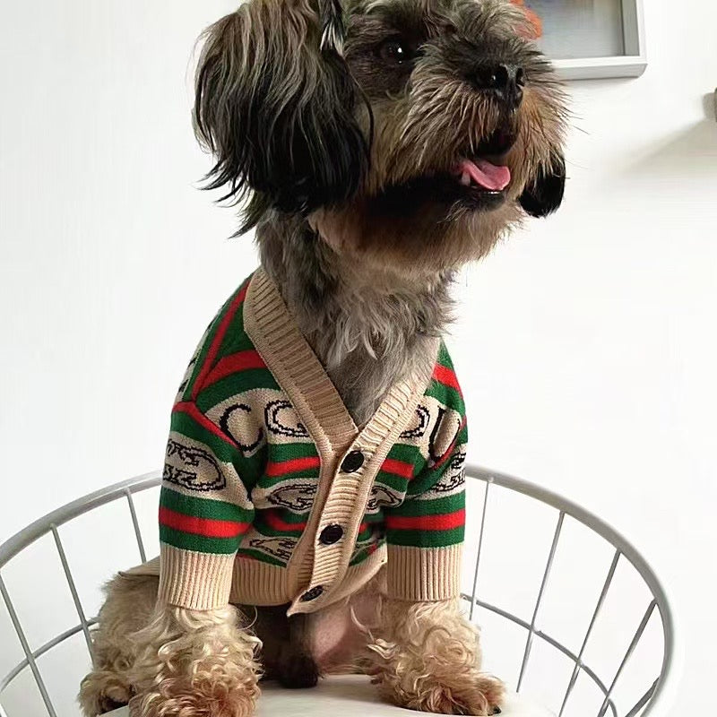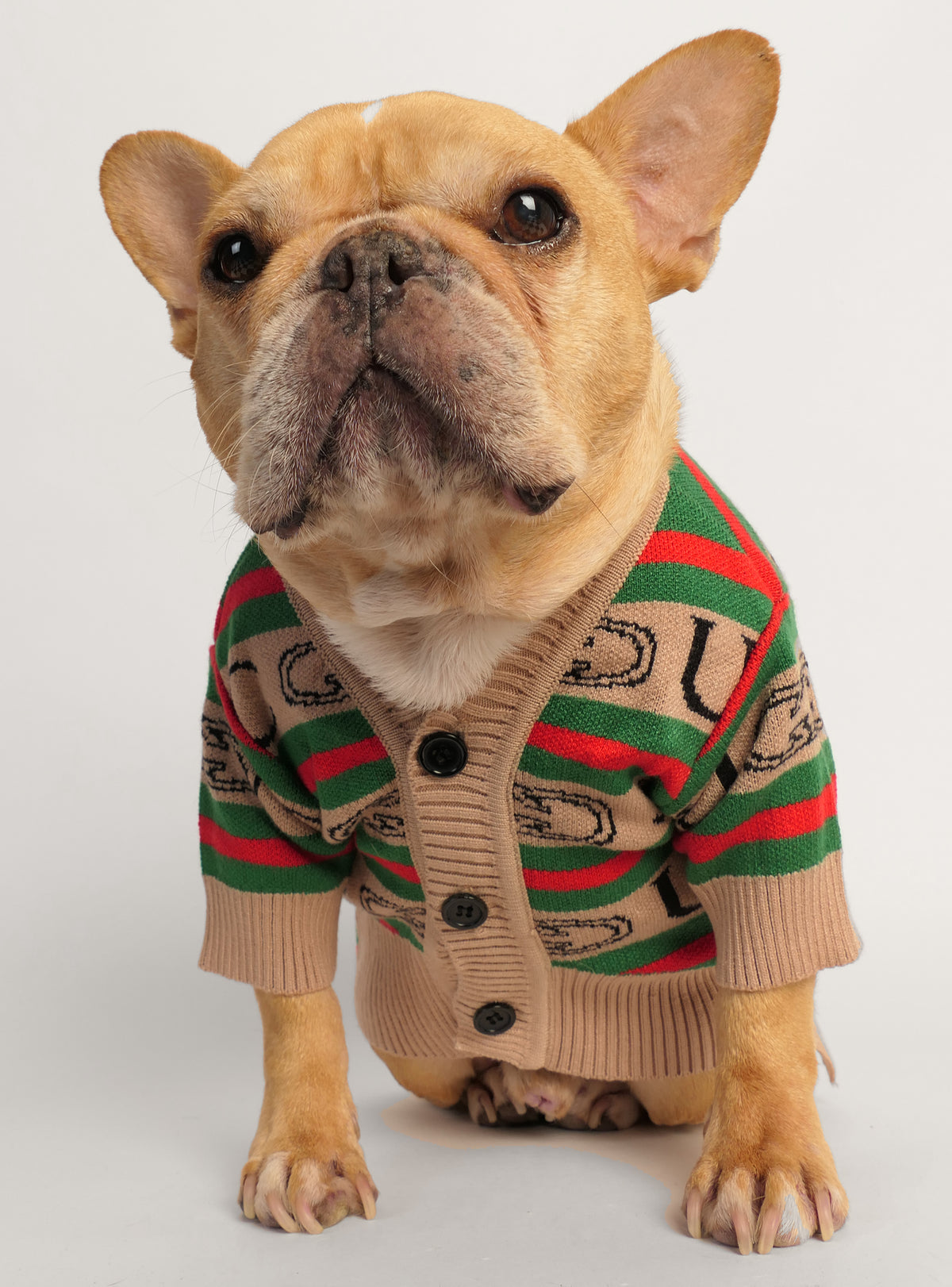 Soft knit pet sweater, featuring: 100% cotton. Huey (Frenchy) has a chest measurement of 19" and wears size L.