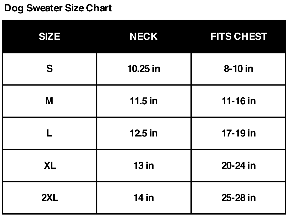 *PLEASE NOTE: These sweaters are sized differently than our dog tees. Be sure to check your pet's measurements before ordering. If you are in between sizes, order the larger size