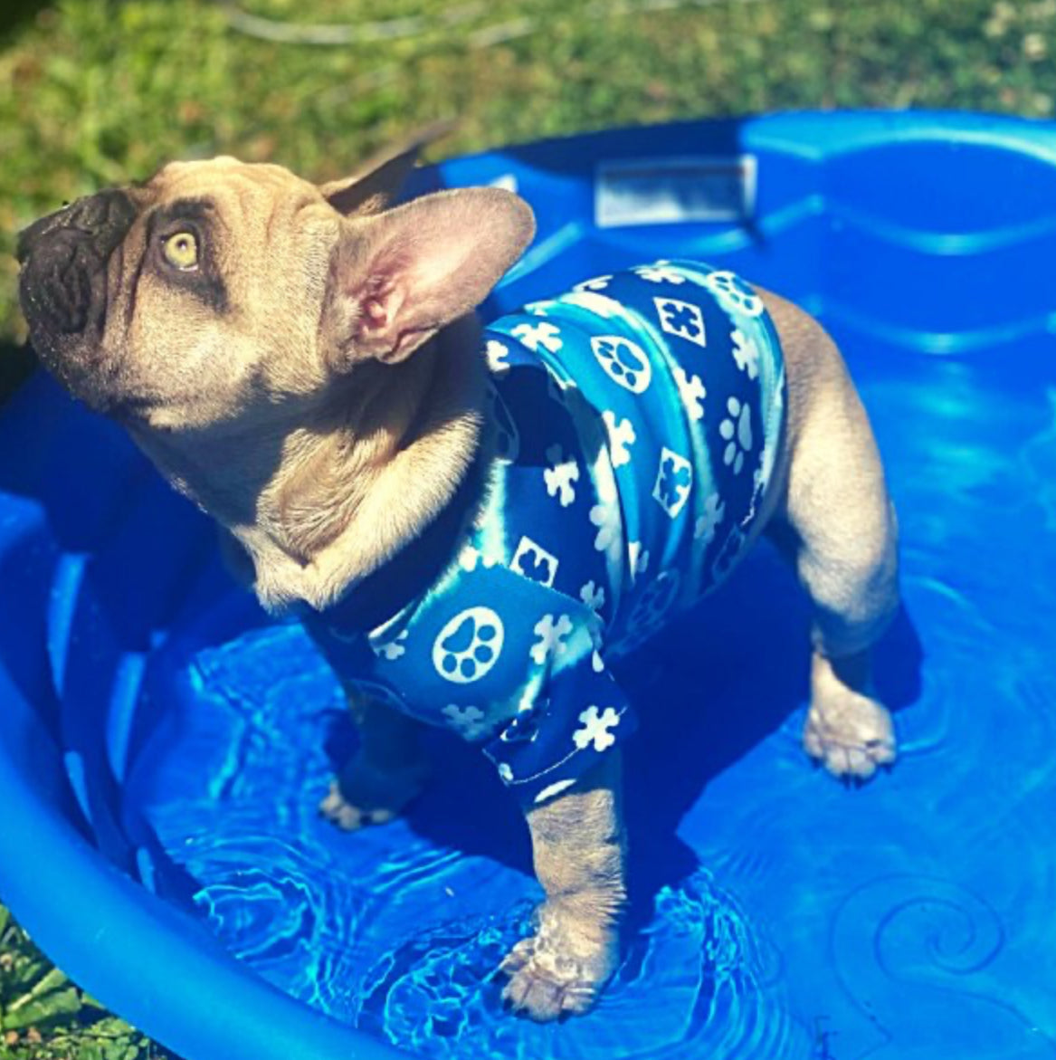 This designer dog t-shirt is made of premium cotton and is easy to wash in the washing machine. With the unique monogram design of our dog pajamas, your dog will be like no other in the town. You can choose from a blue or pink dog t-shirt. Moreover, these quality t-shirts for dogs are very comfortable to wear.